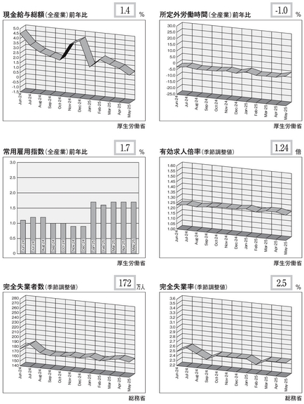 2025年5月の各指数はおおむね水平状態。中期で見ると、現金給与総額のグラフは右下がりになっている。2024年8月「前年比4.5%」がピークで、2025年5月は「前年比1.4%」にとどまる。ただ、依然前年比プラスの勢いは維持している。