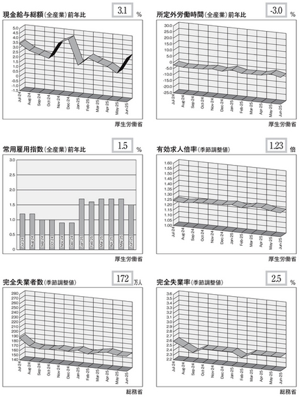 2025年6月の「所定外労働時間」は前年比「-3.0%」。しかし、「毎月勤労統計」では産業別の数値も発表されていて、6月に限ってみると、医療・福祉は「-6.1%」、卸売・小売業は「-5.6%」と減少幅が顕著。対して製造業では「0.0%」と前年と変化なく、産業間で推移動向に差がある。